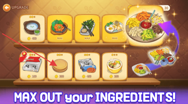 1、在食材界面用金币升级菜品,解锁新食谱后,按顾客需求搭配食材制作并上菜。