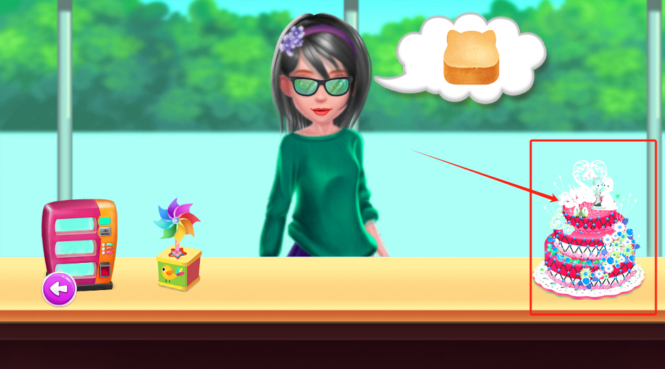 2、戴墨镜女士要蛋糕,点红框里的三层蛋糕给她,桌上机器和风车先不管。