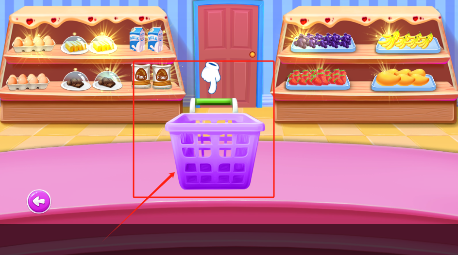 3、红箭头指紫色篮子是要买的,点它买面粉,货架其他东西先不用拿。