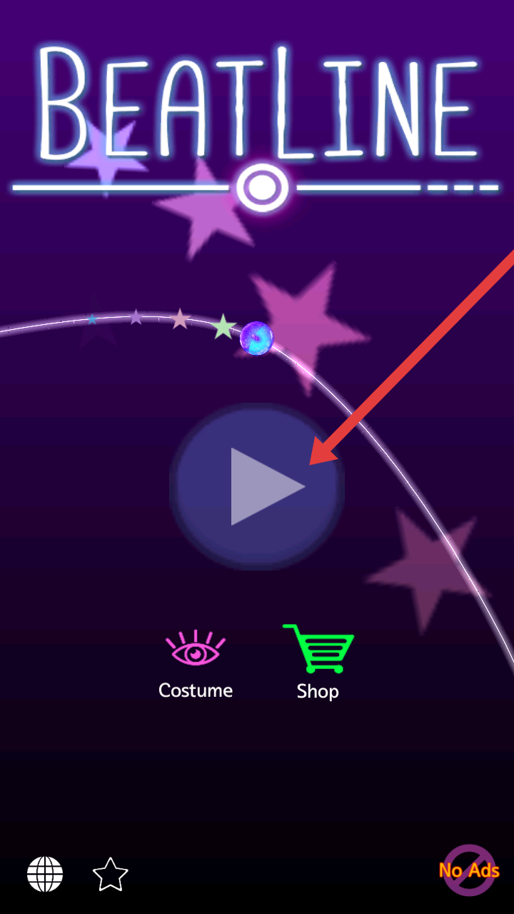 1、进入BeatLine主界面,点击中间播放按钮开启游戏,也可通过【Costume】查看装扮、【Shop】进入商店探索内容。