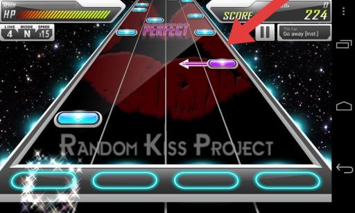 1、进入演奏界面,跟随滑动音符(如紫色箭头)精准点击,获取【PERFECT】判定,同时关注HP条与分数(SCORE),保障演奏续航与得分。