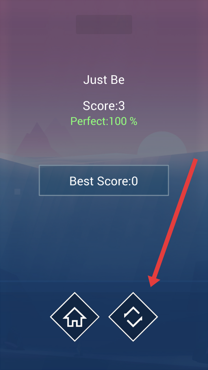 1、游戏结束后,界面展示本次分数、完美度与历史最佳,点击左侧【房子图标】回主页,或右侧重玩图标开启新挑战。
