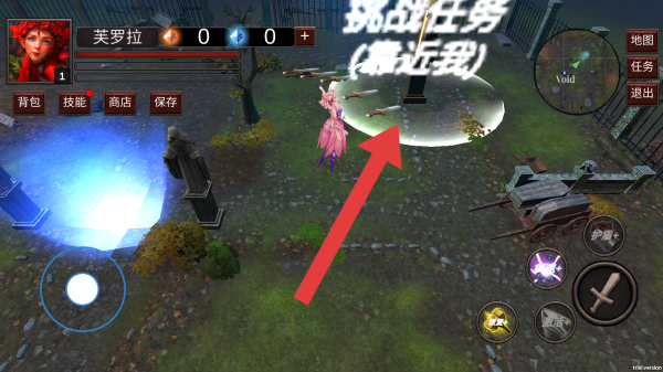 3、实体信息有角色“芙罗拉”,界面显示“挑战任务(靠近我)”,还有背包、技能、商店、保存等功能按钮,以及地图、任务、退出等选项,呈现的是任务场景。