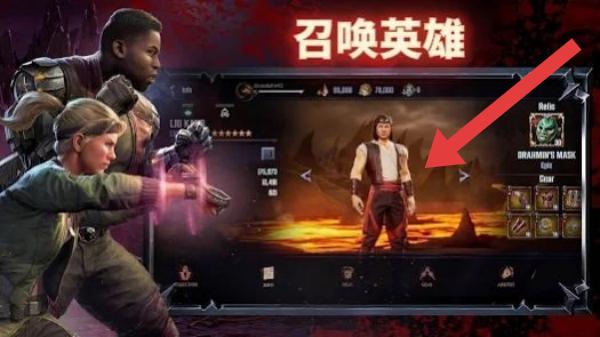 3、画面中文字提示“召唤英雄”,展示的是召唤英雄界面,左侧有几位战斗姿态的角色,右侧红箭头所指是被召唤出的英雄形象,旁边还有该英雄相关道具展示。