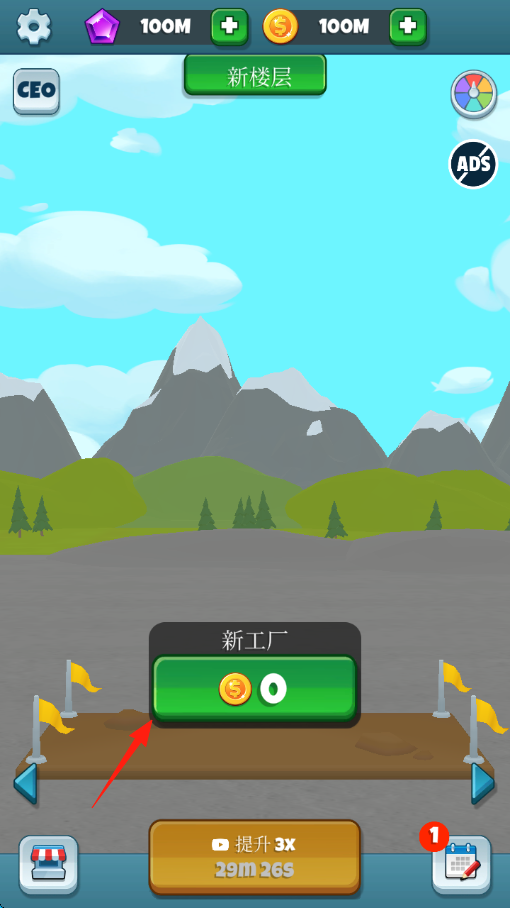 1、初始界面,点击【箭头】指向“新工厂”按钮,花费金币建造新工厂。