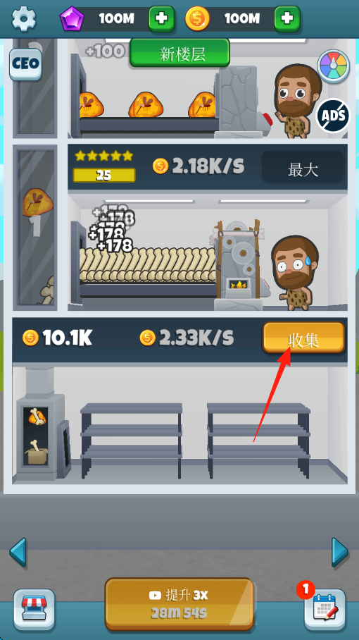 3、当有金币可收集时,点击【箭头】指向“收集”按钮,获取金币,用于升级。