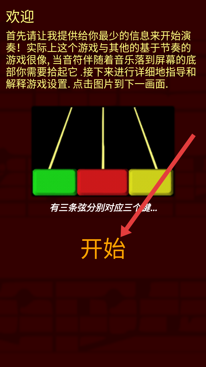 2、在教程页面,阅读玩法说明(音符随音乐落至底部需点击,对应三条弦的三个键),点击【开始】进入实操教学。