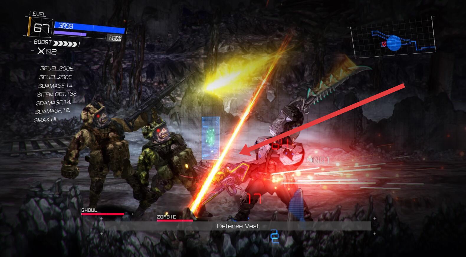 1、地下场景战斗时,操控角色用武器攻击【GHOUL】【ZOMBIE】,关注左上角血量与【BOOST】条,满槽时释放增益技能,提升输出效率。