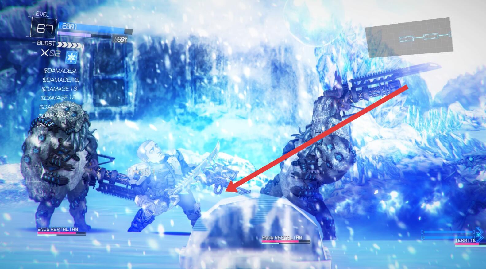 2、进入冰雪场景,应对持重武器的【SNOW REPTILIAN】,灵活闪避冰系攻击,利用场景掩体降低伤害,稳步消耗敌人血量。