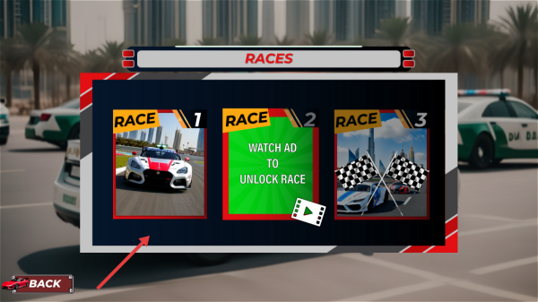 1、主界面点“PLAY”,忽略广告、功能键,进赛事选页,选“RACE1”(解锁),驾驶超跑,开启城市赛道竞速。