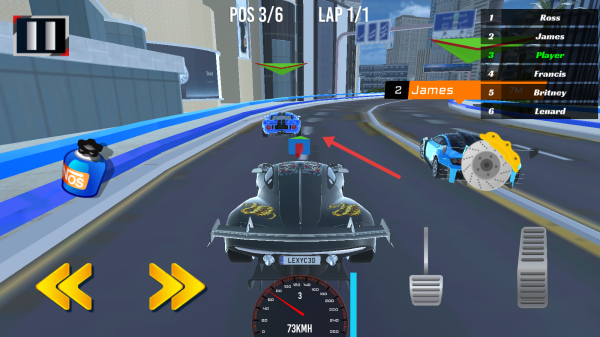 3、竞速时,看“POS3/6”追前两名(James等),直道用NOS加速(蓝罐),弯道漂移超,跑完1圈,冲线赢奖励,解锁新赛事。