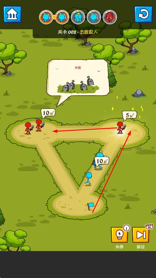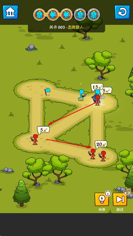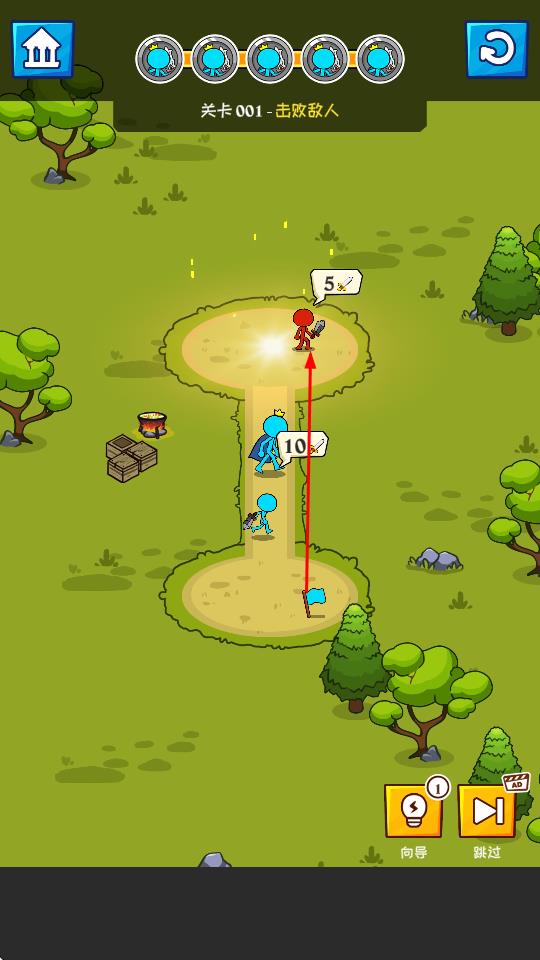 1、进入关卡界面,点击己方蓝色火柴人部队,沿路径向敌方红色敌人移动,开启战斗流程,推进关卡进程。