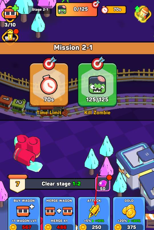 2、关卡中,合并同类型列车提升战力,部署武器与防护措施,灵活分配资源应对不同地图的僵尸攻势,必要时与队友协同防御。