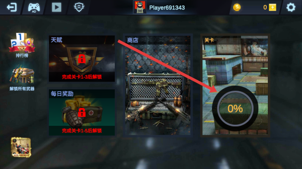 1、主界面点击“关卡”区域(0%进度),进入关卡选择页,准备开启射击闯关,推进游戏进程。