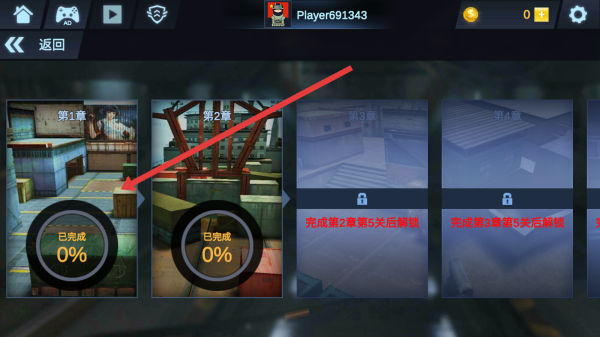 3、关卡选择页,选“第1章”(已完成0%),进入首章关卡,开始战斗,完成任务,解锁后续内容。