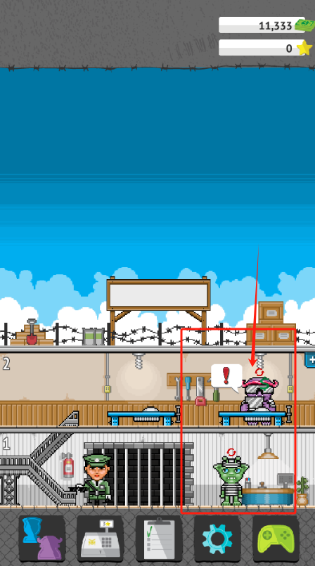 3、红框机器有警报,钱到11333了,要处理绿色外星人囚犯的问题。