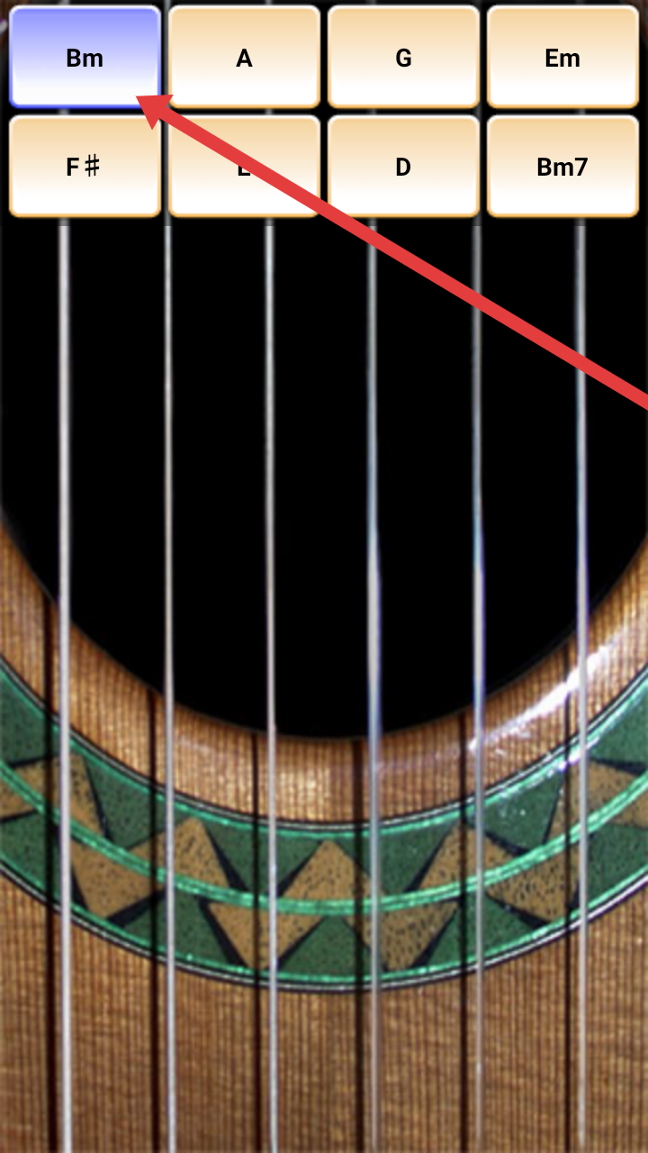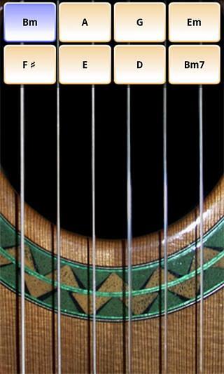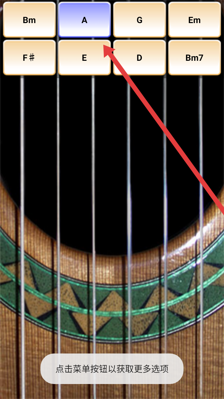 2、在和弦选择界面,点击【A】【G】等和弦按钮,配合吉他弦模拟弹奏,底部可点菜单按钮获取更多选项。