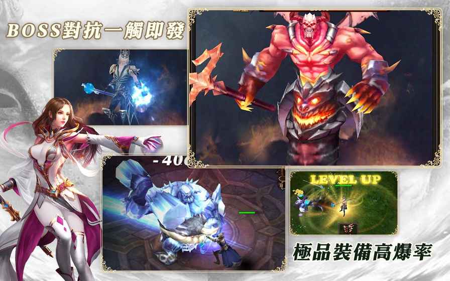 1、参与BOSS對抗,直面巨型恶魔、冰系怪物等強敵,極品裝備高爆率,激戰中收穫珍稀道具。