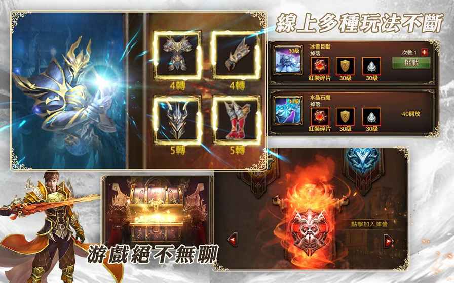 2、养成系统丰富全:包含经典养成系统,装备星铸、宝石镶嵌、翅膀升阶、神装打造等应有尽有,流畅体验让人们只需专注游玩,无需顾虑其他,为成长提供路径。