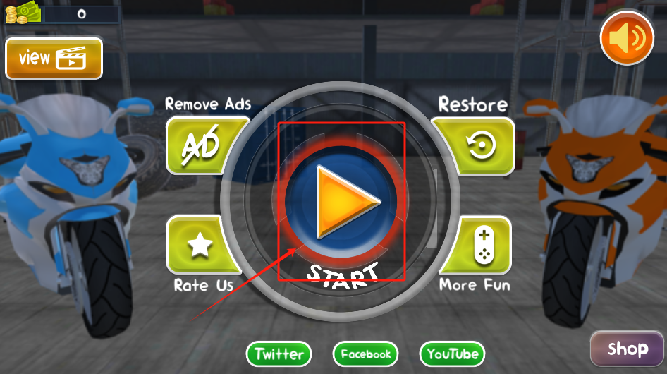 1、点击中间的黄色START按钮开始游戏,左右两边的摩托车可以选。