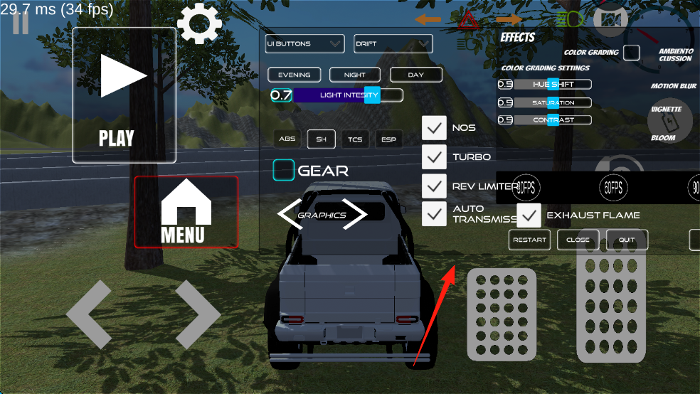 1、点击“Start”开始,用左右箭头控车行驶,可在设置界面调整灯光、驾驶辅助等参数。