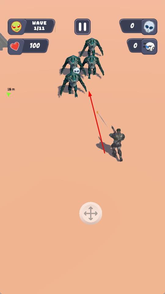 1、进入战斗,操控角色移动(方向键),瞄准外星怪物射击,应对“WAVE1/11”等波次敌人进攻。