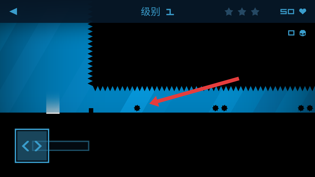 3、在级别1关卡中,通过左侧虚拟按键操控角色,躲避锯齿障碍与黑色尖刺,谨慎前行以完成关卡挑战。