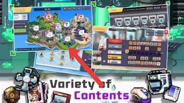 2、展示了地图界面、物品界面等不同场景,配文“VarietyofContents”(多样的内容),是一款内容丰富的像素风格。