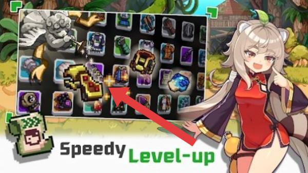 3、画面中展示了一个穿着旗袍风格服饰、有着兽耳的女性角色,左侧是物品界面,下方配文“SpeedyLevel-up”(快速升级),推测是一款具备快速升级元素的像素风。