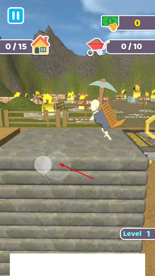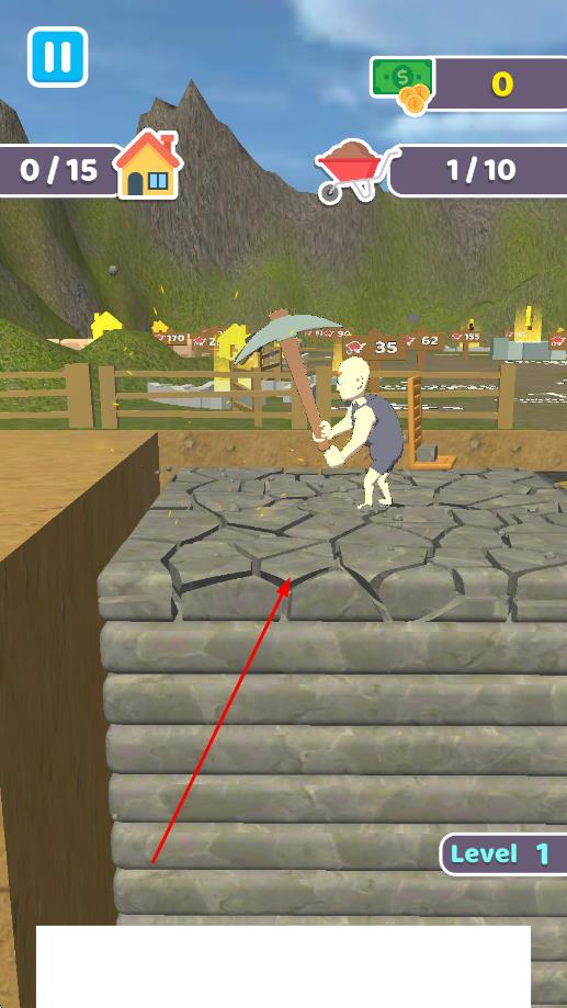 1、进入游戏后在矿洞界面选择初始工具,点击砖块区域开始挖掘,滑动屏幕调整视角查看矿洞地形。