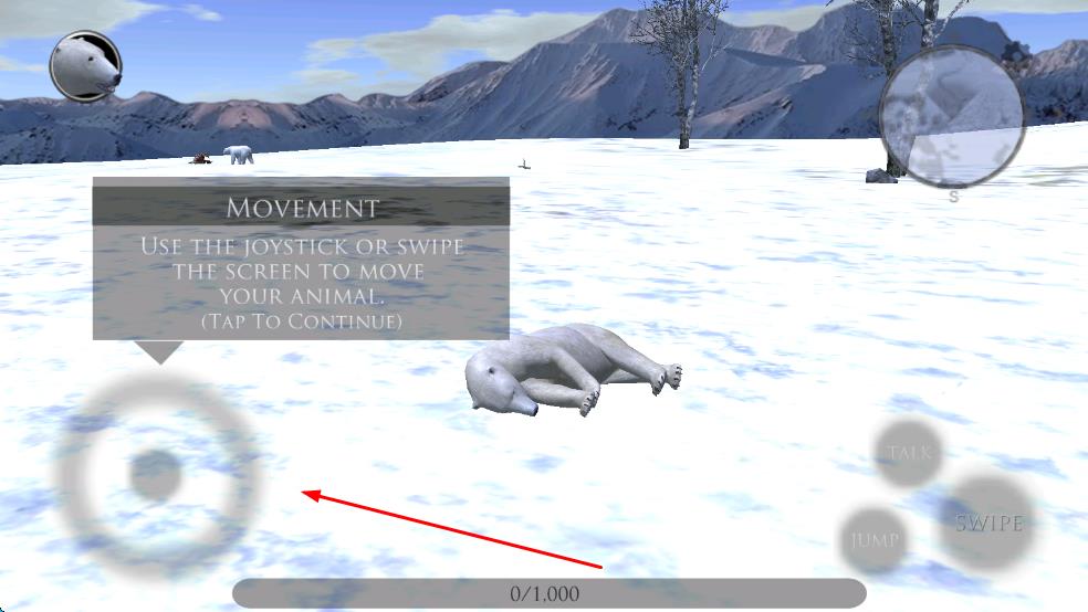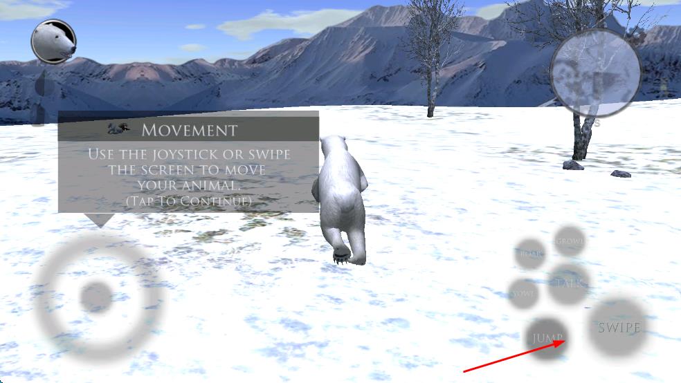 1、进入游戏后在雪原场景操控北极熊:通过虚拟摇杆移动探索冰原,点击屏幕发动攻击,在浮冰区潜伏等待海豹浮出水面进行狩猎。