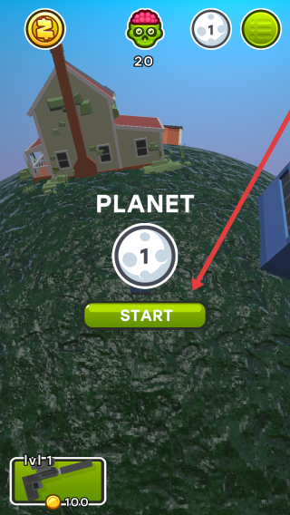 1、主界面点击“PLANET-1”的【START】按钮(箭头指向),进入Level-1星球,开启僵尸射击防御任务。