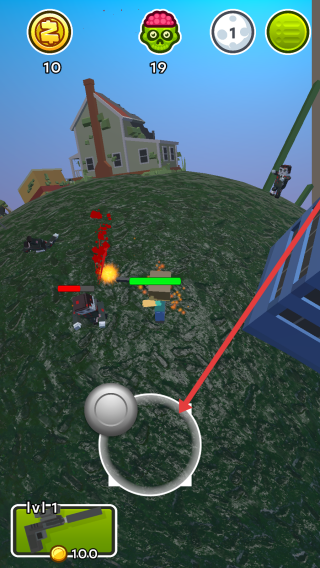 2、战斗中,操控角色(箭头指向射击区域),瞄准僵尸射击,利用武器攻击,清除“19”等数量僵尸,守护星球。
