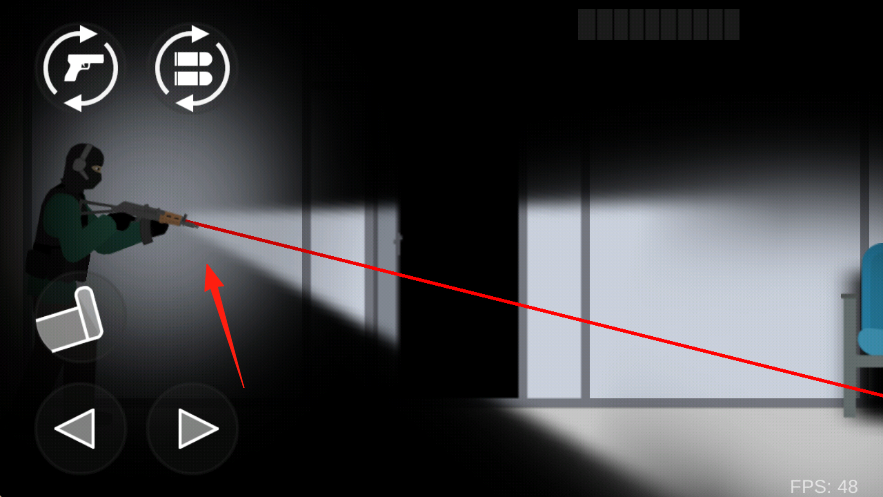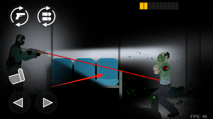 2、场景射击,按箭头指引,用枪械瞄准,在走廊黑暗环境,警惕僵尸,及时射击。