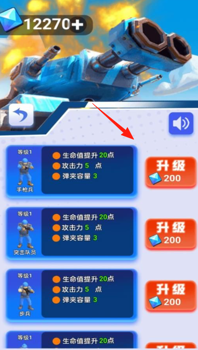2、角色升级在升级界面,根据箭头指示,使用钻石点击“升级”按钮,提升手枪兵、突击队员等角色的生命值、攻击力和弹夹容量。