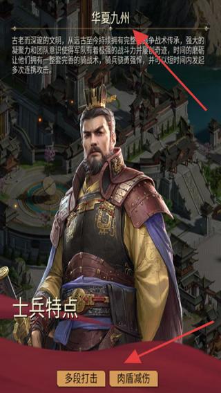 1、首先是华夏九州,领主善于训练骑兵,并且擅长连续攻击敌人,士兵优点是多段打击,肉盾减伤。