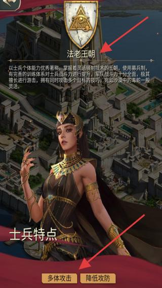 3、最后就是法老王朝了,领主善于训练骑兵和弓兵,并且擅长同时攻击多个目标,士兵优点是多体攻击,降低攻防。