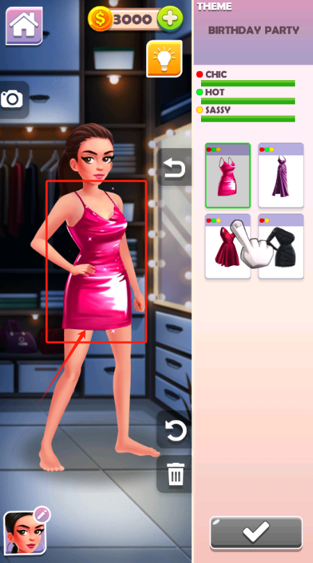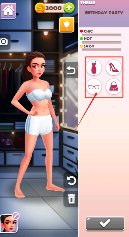 1、选生日派对主题,点裙子图标换粉色吊带裙,钱够3000就点确认按钮。