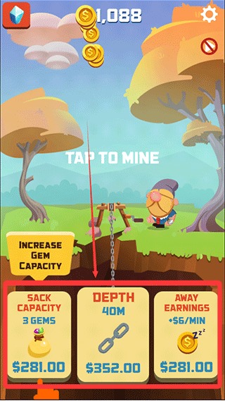 3、通过不断积累金币,进入设备升级环节,强化钩爪抓取能力和挖矿工具,提升挖掘深度与效率,开启新的矿脉。