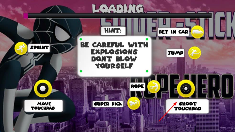1、进入游戏后操控黑蜘蛛火柴人,点击屏幕发射绳索勾住建筑物锚点,通过滑动调整摆荡角度,松开手指完成跳跃,躲避地面尖刺陷阱。