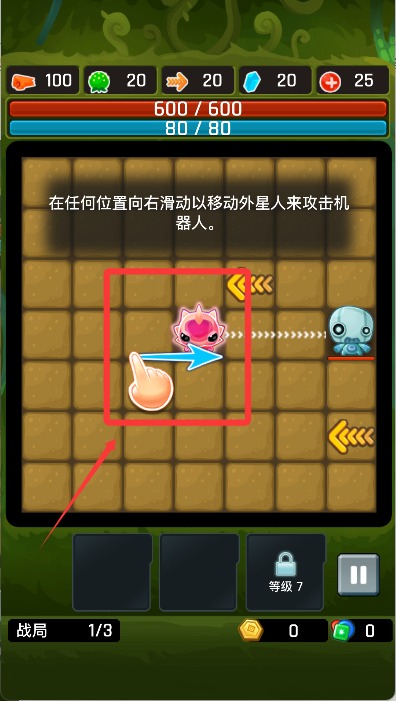 3、开始游戏后在任意位置向右滑动攻击机器人。