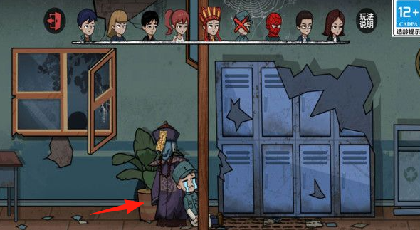 2、进入游戏后,在如箭头所指这类场景中,快速找到类似盆栽后这种隐蔽位置,躲在其中,避免被敌人发现。