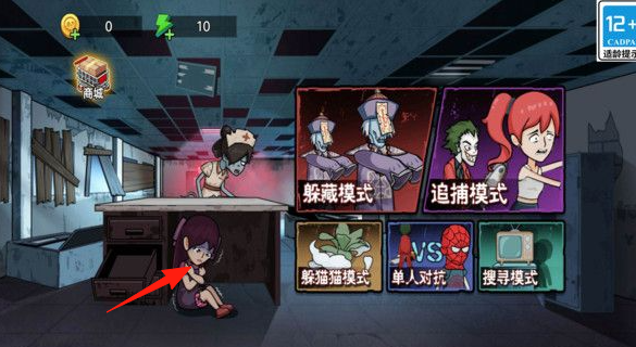 3、在模式选择界面,根据自己的喜好选择模式,比如想体验刺激的追捕可以选追捕模式,选择后,操控角色按照箭头指示,躲在隐蔽处,等待游戏开始并完成对应模式的目标。