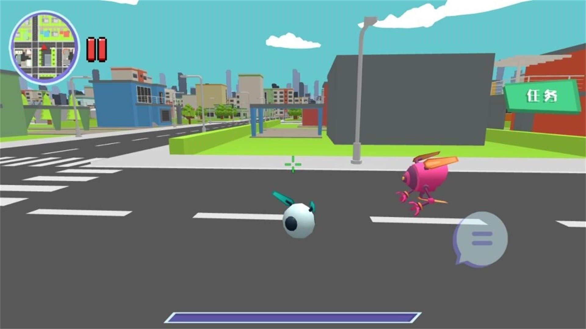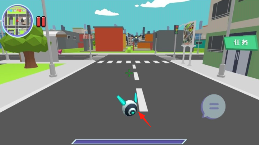 2、进入城市街道,操控箭头标记的机器人,【移动探索】,触发与粉色机器人的互动任务。