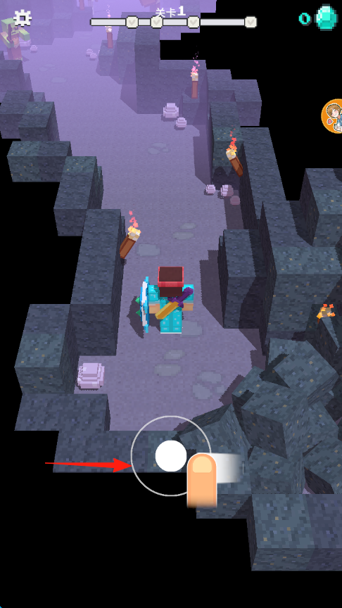 1、关卡1地牢,点击移动按钮,【操控角色沿通道前进】,探索未知区域。