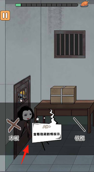 2、遇到门被阻挡,点击箭头指向的木板,【选择道具(木板/铁棍)破坏障碍】,开启通道。