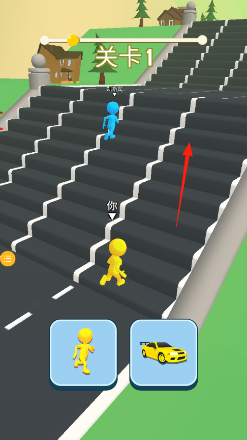 2、关卡1中,操控黄色角色沿箭头方向【攀爬楼梯跑道】,追赶前方蓝色对手。