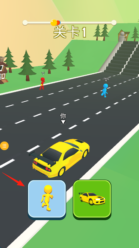 3、遇到弯道或直道,点击切换【黄色角色或汽车】,利用不同移动方式,超越敌人。