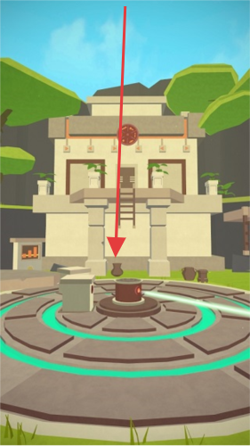3、建筑解谜:神秘建筑场景,查看建筑结构(梯子、圆形装置),尝试互动(攀爬、启动机关),结合周围环境线索,火盆、盆栽。