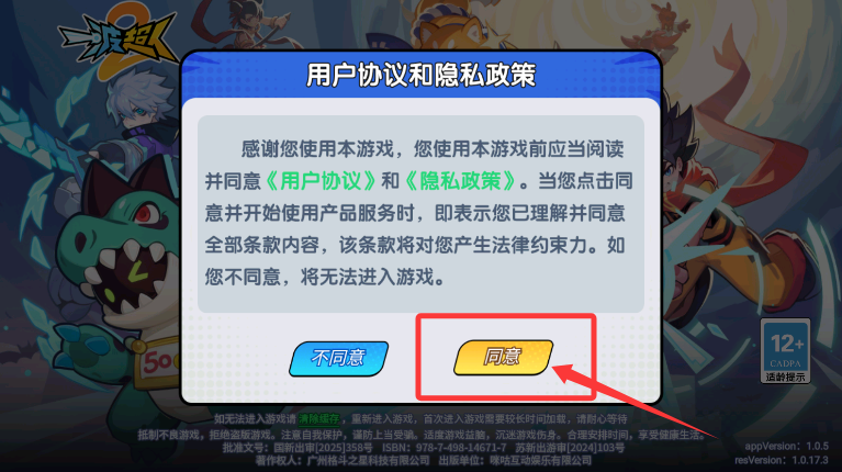 2、仔细阅读并勾选用户协议与隐私条款,确认后继续游戏进程。